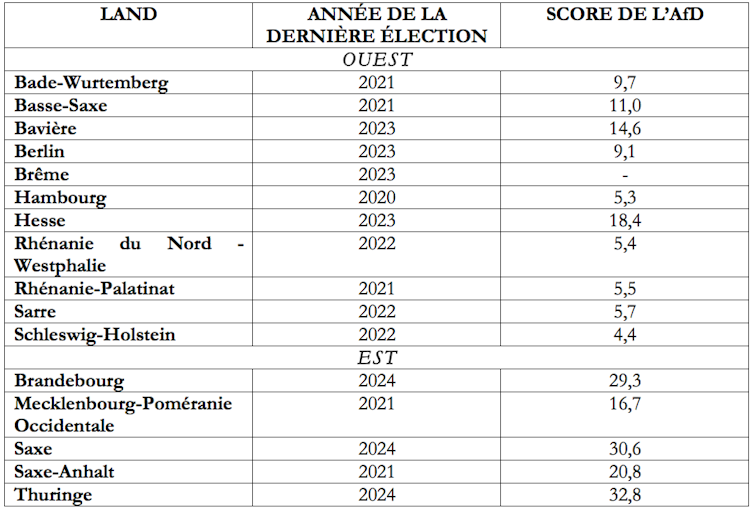 En Allemagne, les élections régionales ne se déroulent pas toutes au même moment dans les 16 Länder, et les comparaisons sont difficiles à établir, tant le contexte politique fédéral et régional peut varier. Reste qu’une comparaison des résultats des seize dernières élections montre bien que l’AfD performe dans les cinq Länder de l’Est, la ville-État de Berlin, située géographiquement à l’Est, étant un cas à part.
